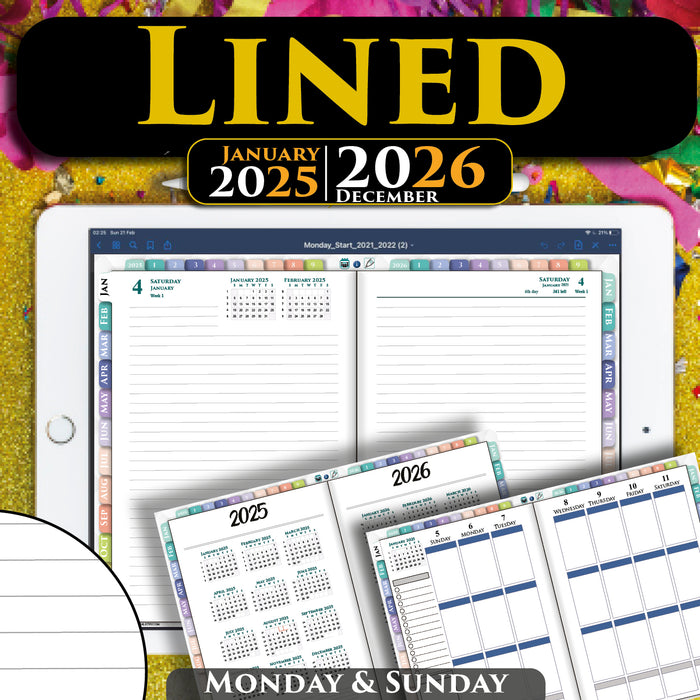 Discover the PDF Digital Daily Planner for iPad with digital lined paper on daily pages, perfect for smooth horizontal digital planning. This Daily planner features vibrant color-coded tabs for each month. You'll receive two versions - one with a Monday start calendar and another with a Sunday start.